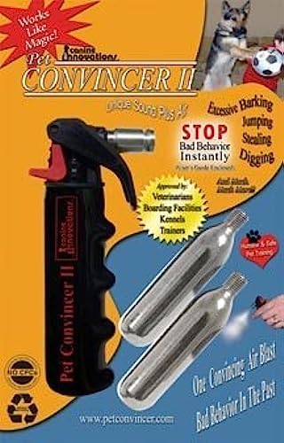 The Pet Convincer II is a uniquely effective pet training device based on intensive research. The Pet Convincer works by releasing a convincing blast of air to redirect and focus the dog’s attention on you. Correct any bad behavior: Excessive Barking, Aggression, Stealing, Digging, Jumping, Whining, Chasing, and much more! The Pet Convincer II features a sleek, contoured hand grip and improved one-piece nozzle to continue the tradition of effective pet behavior control. How to Correct Behavior: The best way to use the Pet Convincer in this situation is to set the problem up and correct it. For instance, if your dog likes to steal food from your dinner table when you aren’t around, set up the dinner table with food on it and spy on your dog from a nearby room. Once he approaches the food, shout a word that sounds like “Ahhhhggtt!!!” and release a convincing, approximately one second burst (blast) of air from the Pet Convincer. If you win a few of these specific battles, you will win the war!