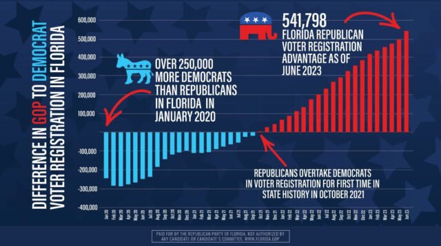 “Month after month, Florida becomes a darker shade of red,” he said. “This is great news, but we must keep our foot on the gas until the Florida (Democratic) Party waves the white flag of surrender, which looks more and more inevitable with every new voter registration monthly update.”