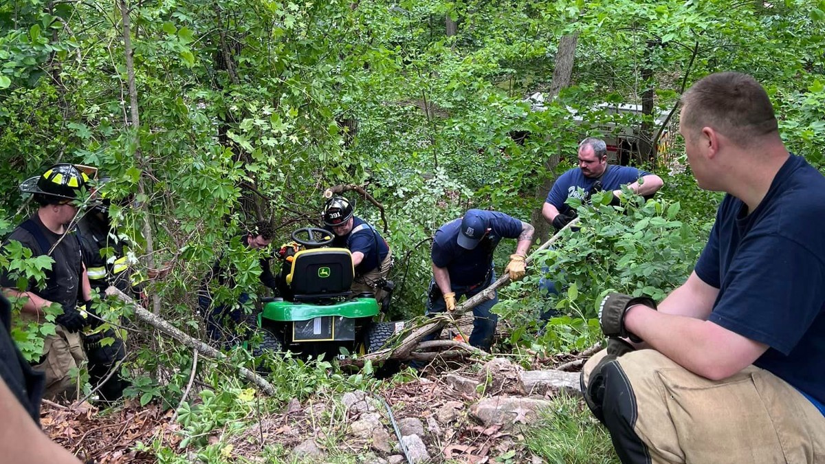 Crews helped remove the lawn tractor from the woods after the man was rescued.