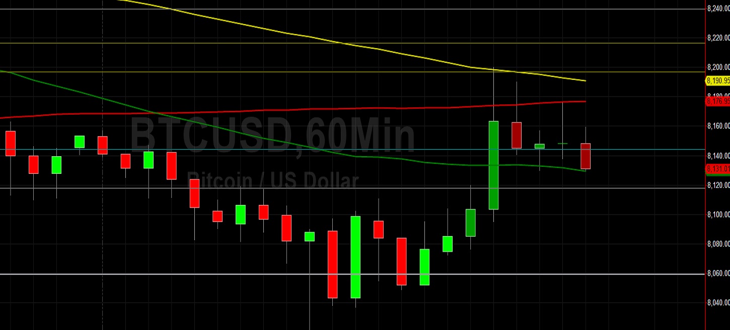 Bitcoin (BTC/USD) appreciated to the 8176.18 level early in today’s Asian session as the pair tested its 50-bar MA (4-hourly) and them came off. Bids emerged around the 8020.20 area during yesterday’s European session after negative market sentiment saw the pair glide lower during Friday’s European session and test the 8002.21 level after some Stops were elected below the 8019.59 area, a level that represents the 61.8% retracement of the 7701.00 – 8535.00 range. Traders have been unable to retest the 8260.37 area following the move lower, and this level is significant because it represents the 61.8% retracement of the 8419.95 – 8002.21 range.